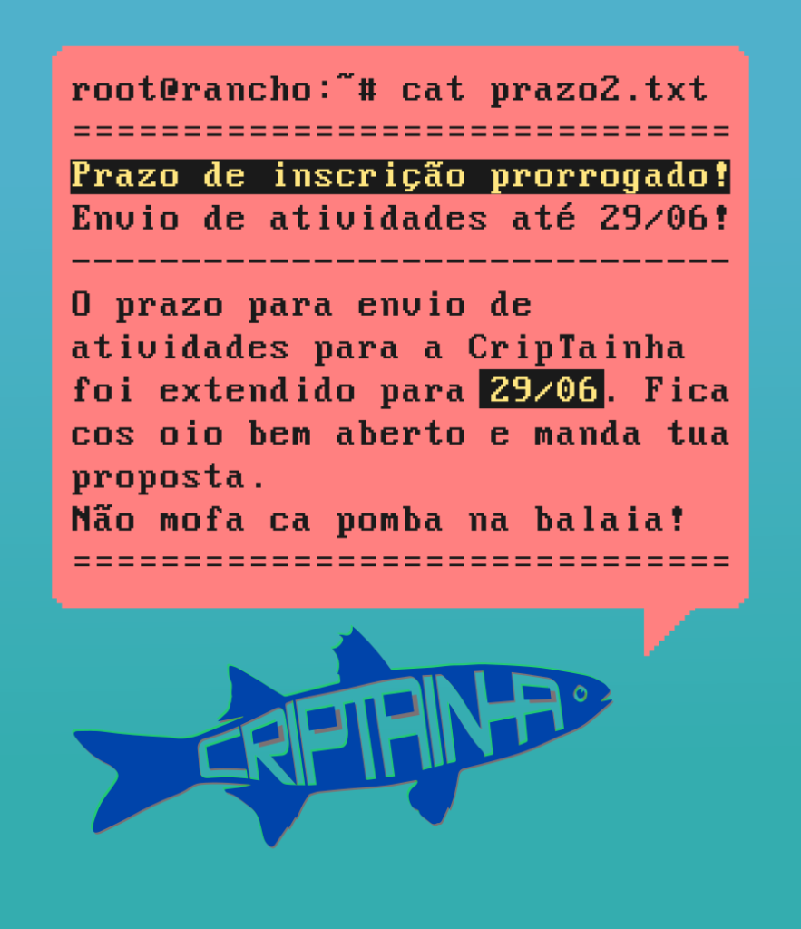 Alô cardume! O prazo para envio de atividades para a CripTainha foi prorrogado e termina no dia 29/06.